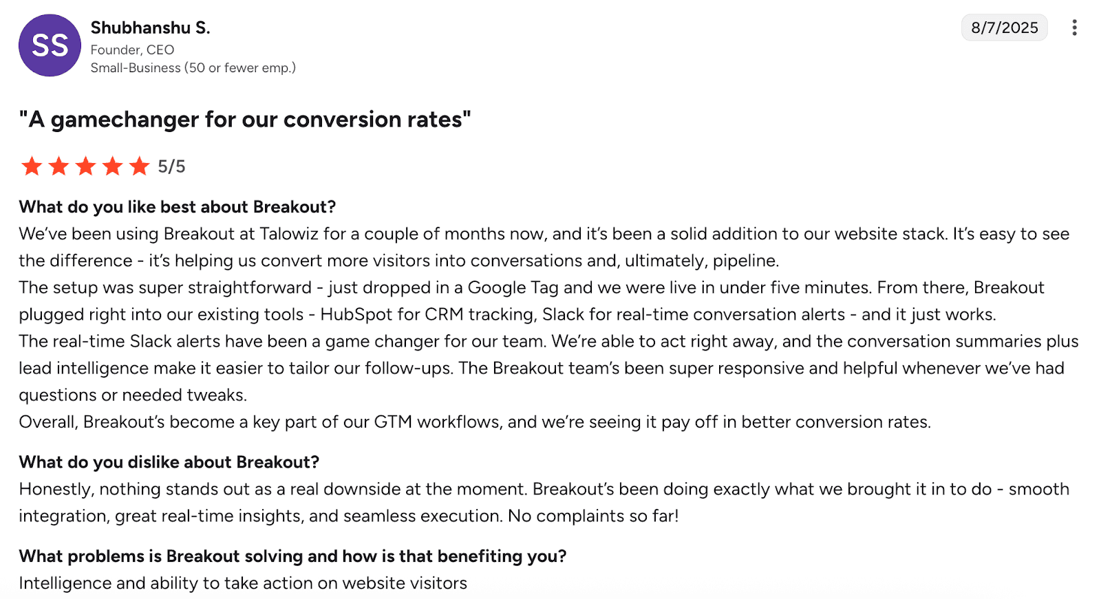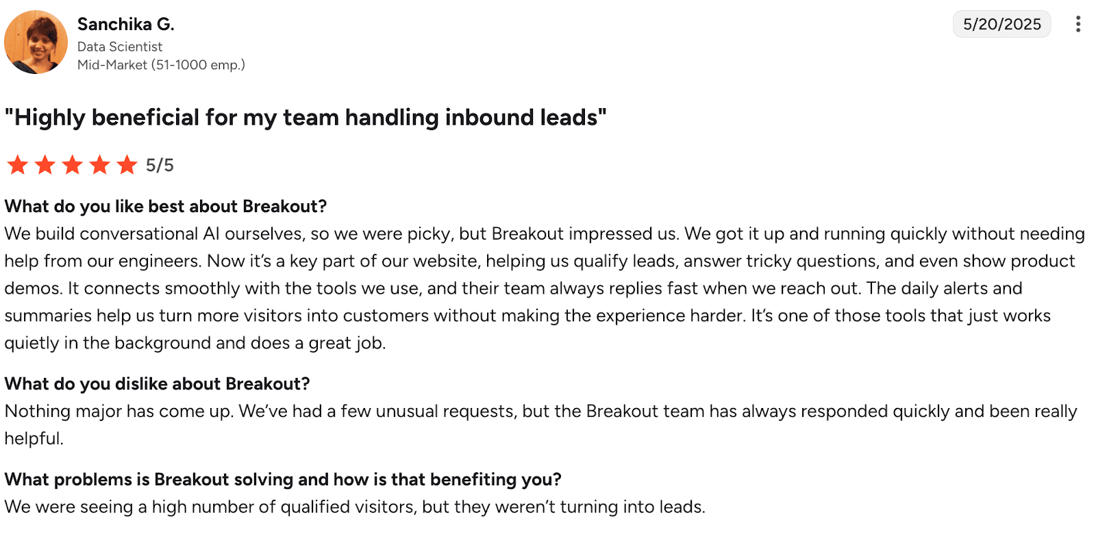 1. It operates during the moment of intent, not before it: 6sense identifies accounts before they visit. Breakout engages them while they are actively researching and continues the conversation after they leave, ensuring no high-intent visitor is lost.