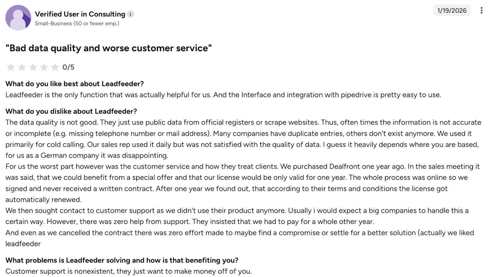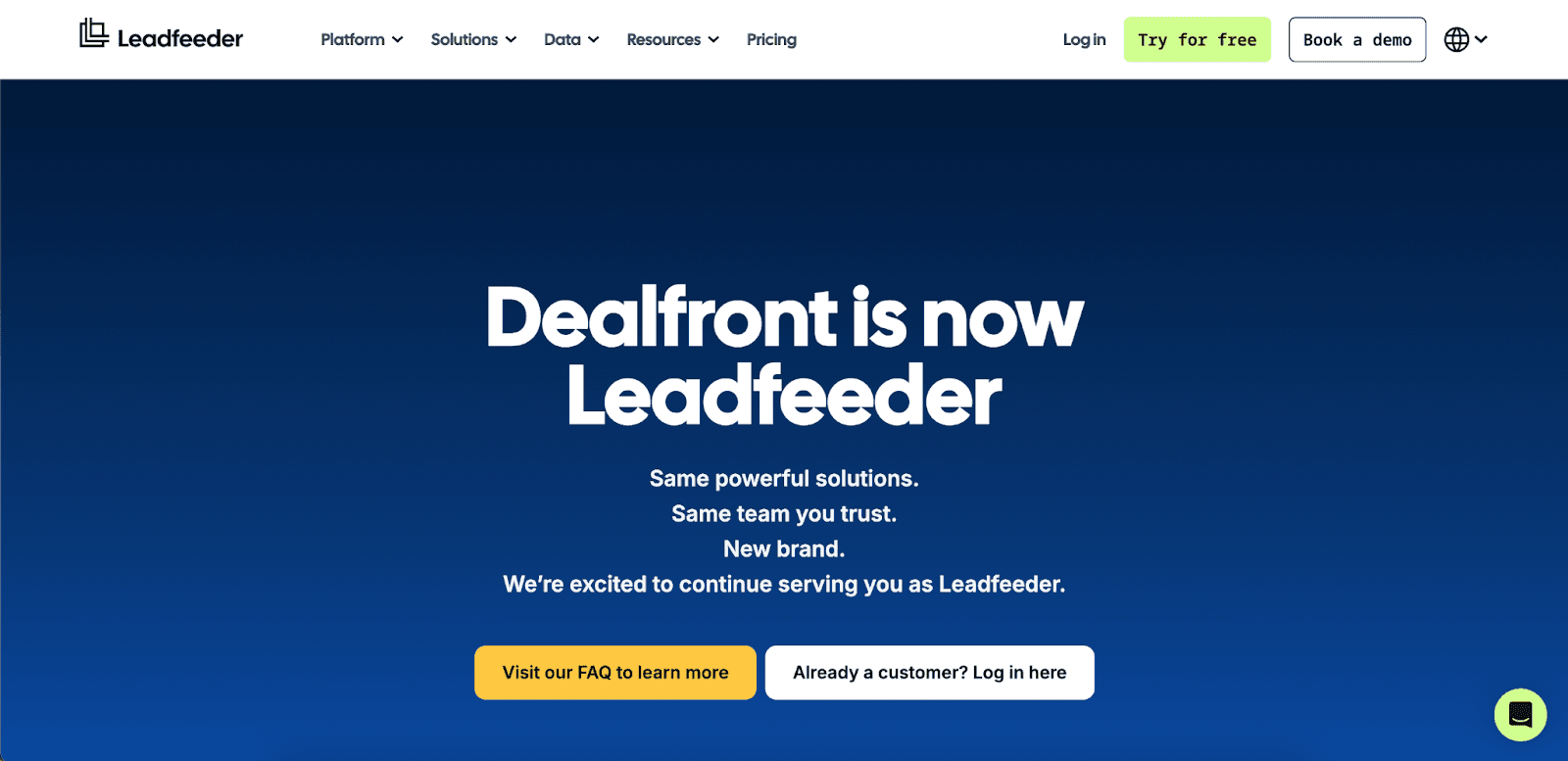 Dealfront combines European intent data, visitor identification, and enrichment in one platform. It grew from Leadfeeder's strong EU data coverage into a full GTM intelligence suite.
