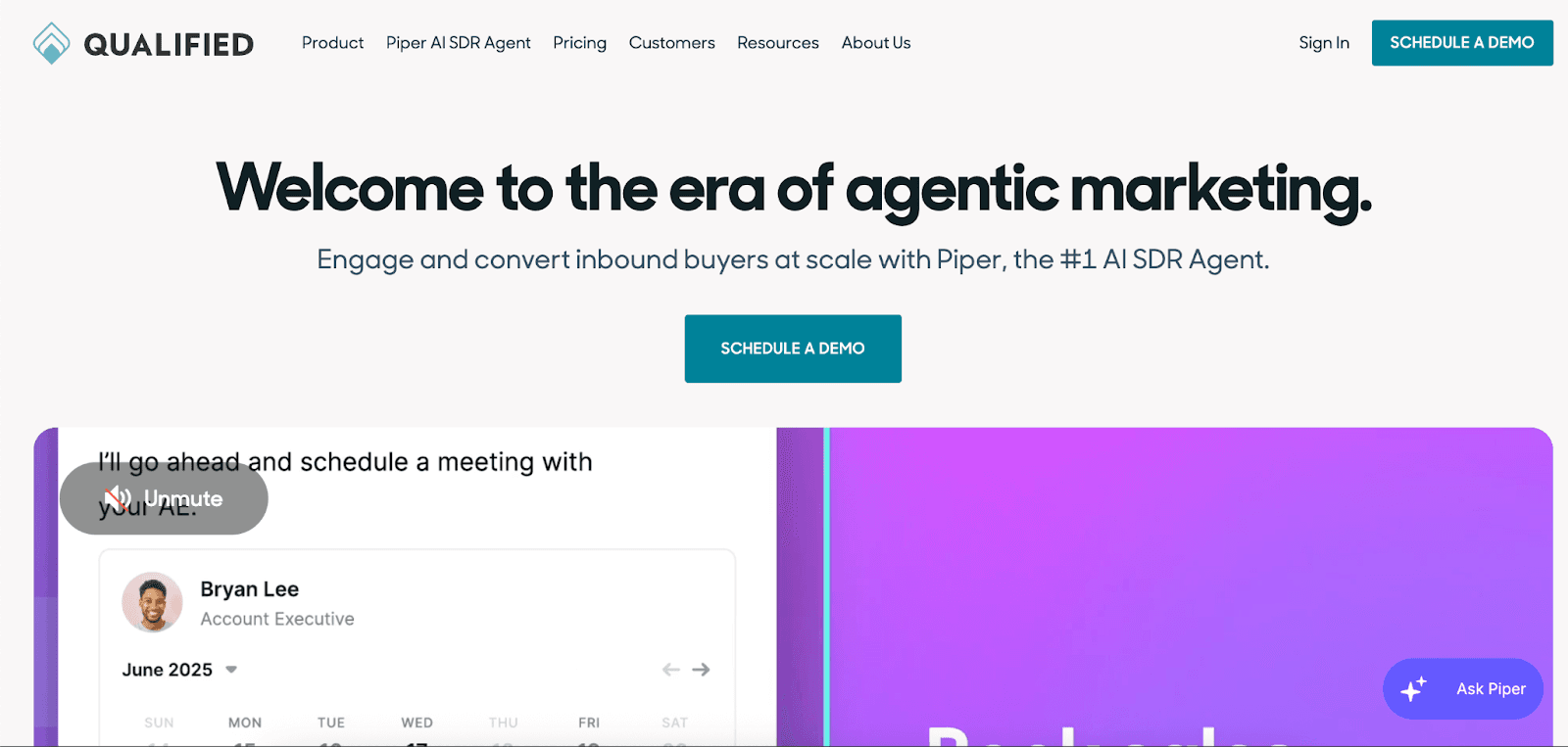 Qualified brings conversational marketing to Salesforce-native teams with strong routing logic. Its AI agent, Piper handles chat conversations and books meetings with qualified visitors.