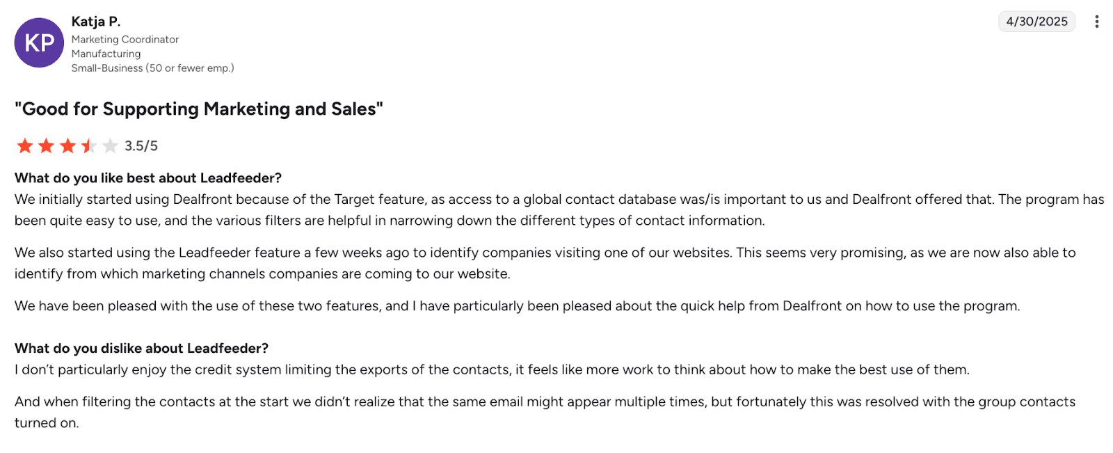 Teams prioritize Dealfront when GDPR compliance and regional data accuracy matter most. The platform offers solid identification but requires manual follow-up for conversion workflows.
