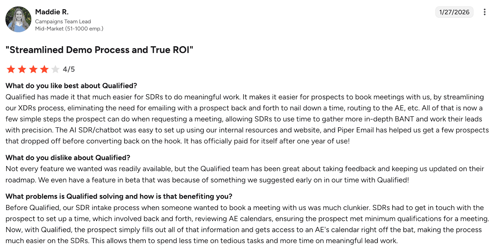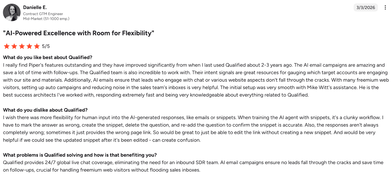If you run a Salesforce-native motion with dedicated SDR coverage, Qualified can support chat-based engagement and routing. It works best when you have the resources to manage conversations and workflows manually.