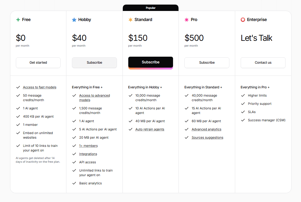 Chatbase uses a credit-based pricing model where AI responses consume credits based on model complexity and response length. While manageable at low usage, costs can become unpredictable as traffic and engagement increase.