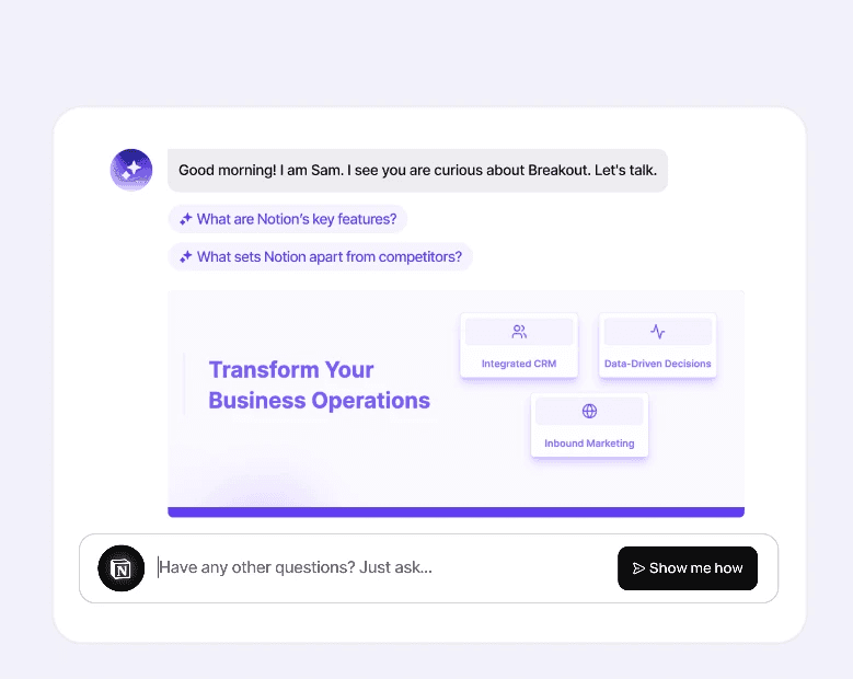 However, it stops at Q&A. Modern AI tools like Breakout can identify who is on your site, qualify intent, and guide buyers toward conversion while they are live. Chatbase leaves these steps to sales teams.