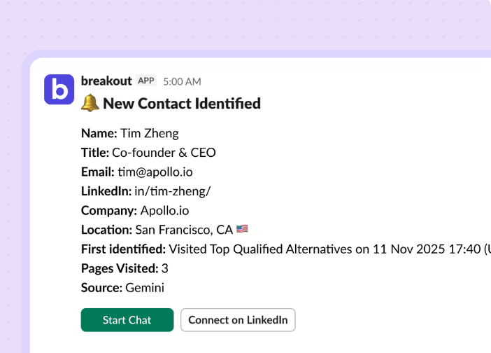 Unlike chatbots that treat every visitor the same, Breakout starts by identifying who is on your site. It performs visitor and company deanonymization using firmographic and behavioral signals.