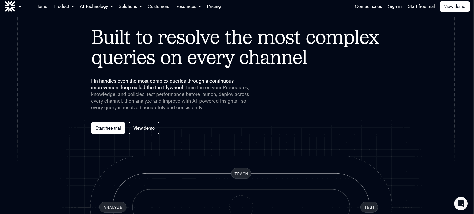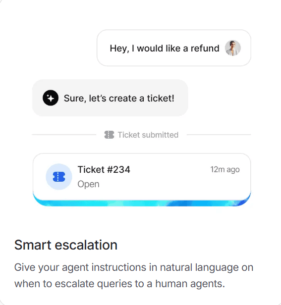 Intercom’s Fin AI agent is built primarily for support automation. It answers help center questions and escalates complex issues to human agents.