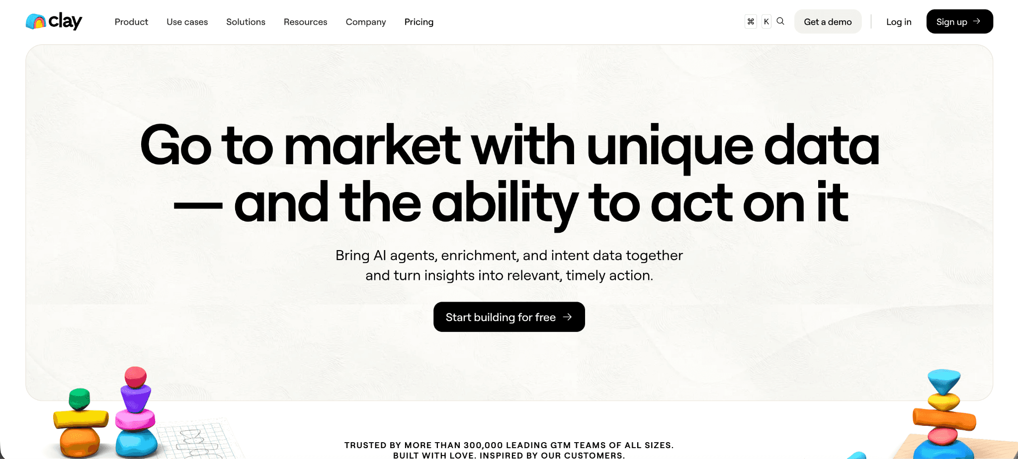 Clay aggregates signals and enriches data across multiple sources, helping teams build targeted workflows. It works well for automating research and segmentation, but it requires manual setup and does not handle engagement or conversion directly.