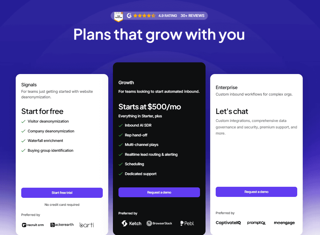 Paid plans start at $500 per month for teams ready to automate inbound.