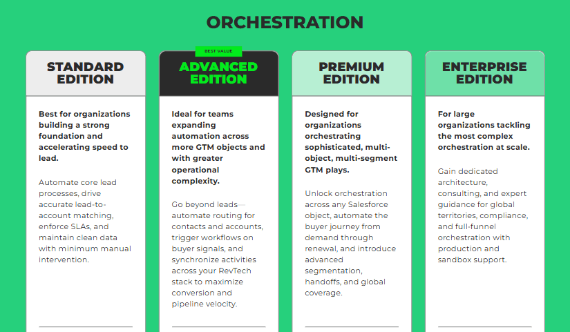 It is sold as layers of orchestration, where each tier adds more control across your GTM system.