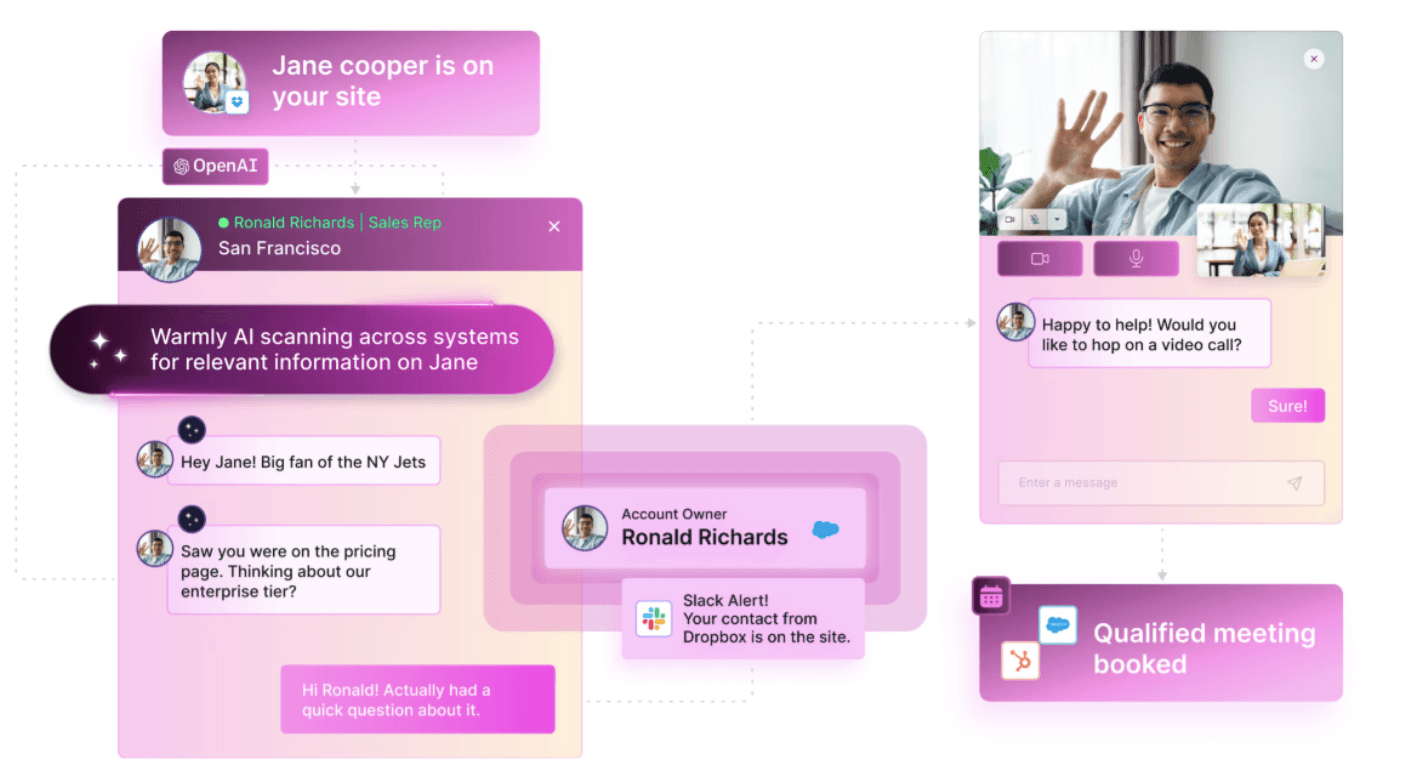 Warmly is a signal-led warm outbound platform built for fast routing and orchestration. It identifies website visitors by person and company, watches intent in real time, then triggers the next action through chat overlays, email, LinkedIn, video, or rep handoff.