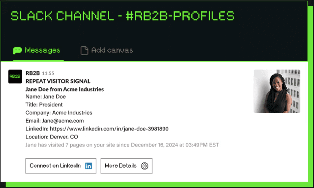 The website visitor identification tool, RB2B, is focused on person-level matches. It works best for U.S. traffic and is designed for speed. When someone visits your site, RB2B can surface their LinkedIn profile and send it to Slack in real time.