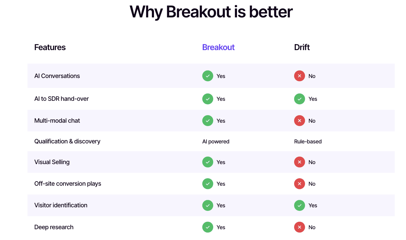 This is why teams comparing Drift vs. Breakout often focus on speed, coverage, and conversion ownership.