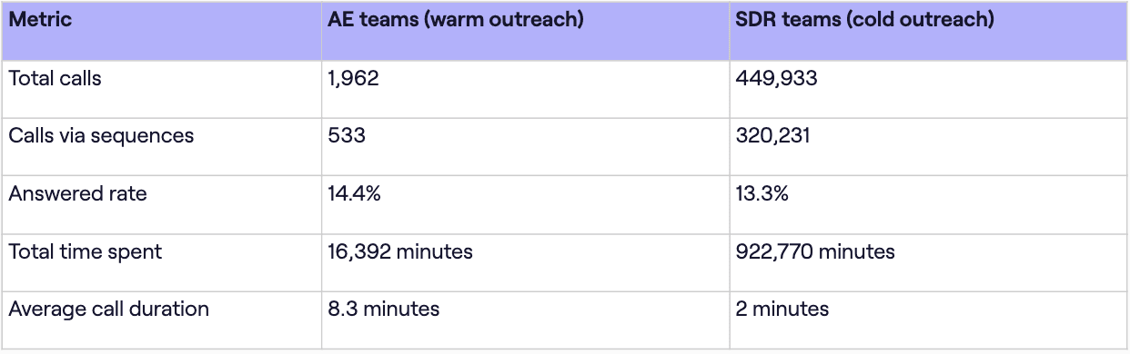 In 2025, Cognism analyzed outbound activity across SDR-led cold outreach and AE-led warm outreach. AEs ran fewer calls, but their calls lasted much longer.