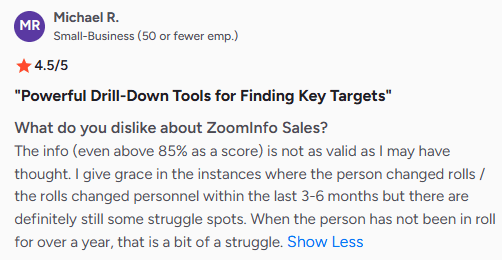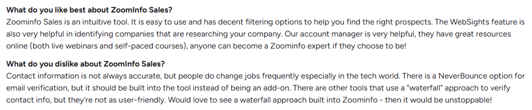 They mentioned that while ZoomInfo’s data is generally strong, it isn’t always reliable. Minor gaps are understandable when someone recently changes roles, but outdated information for long periods makes it harder to trust.