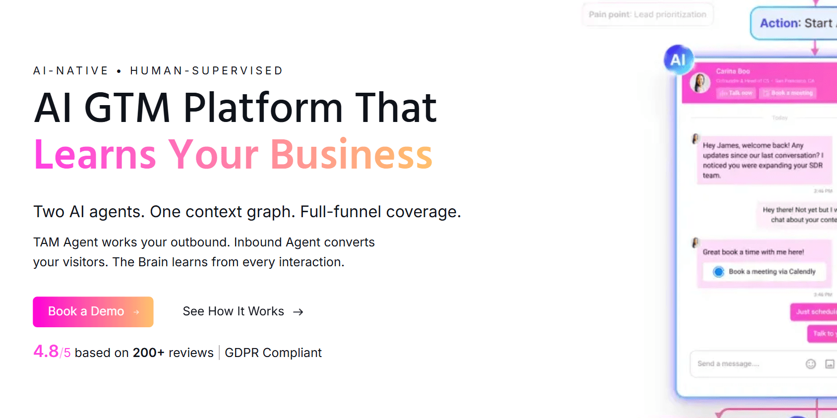 It engages visitors while they’re still active, qualifies them in real time, and moves them toward meetings without waiting on manual outreach.